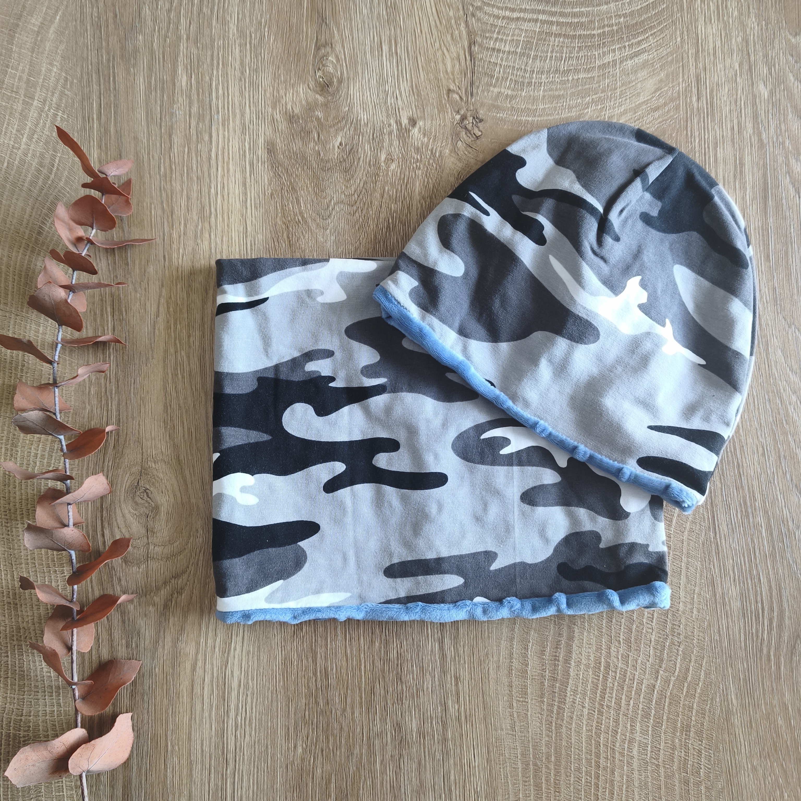 Otroška kapa in šal buff – siva z vojaškim vzorcem