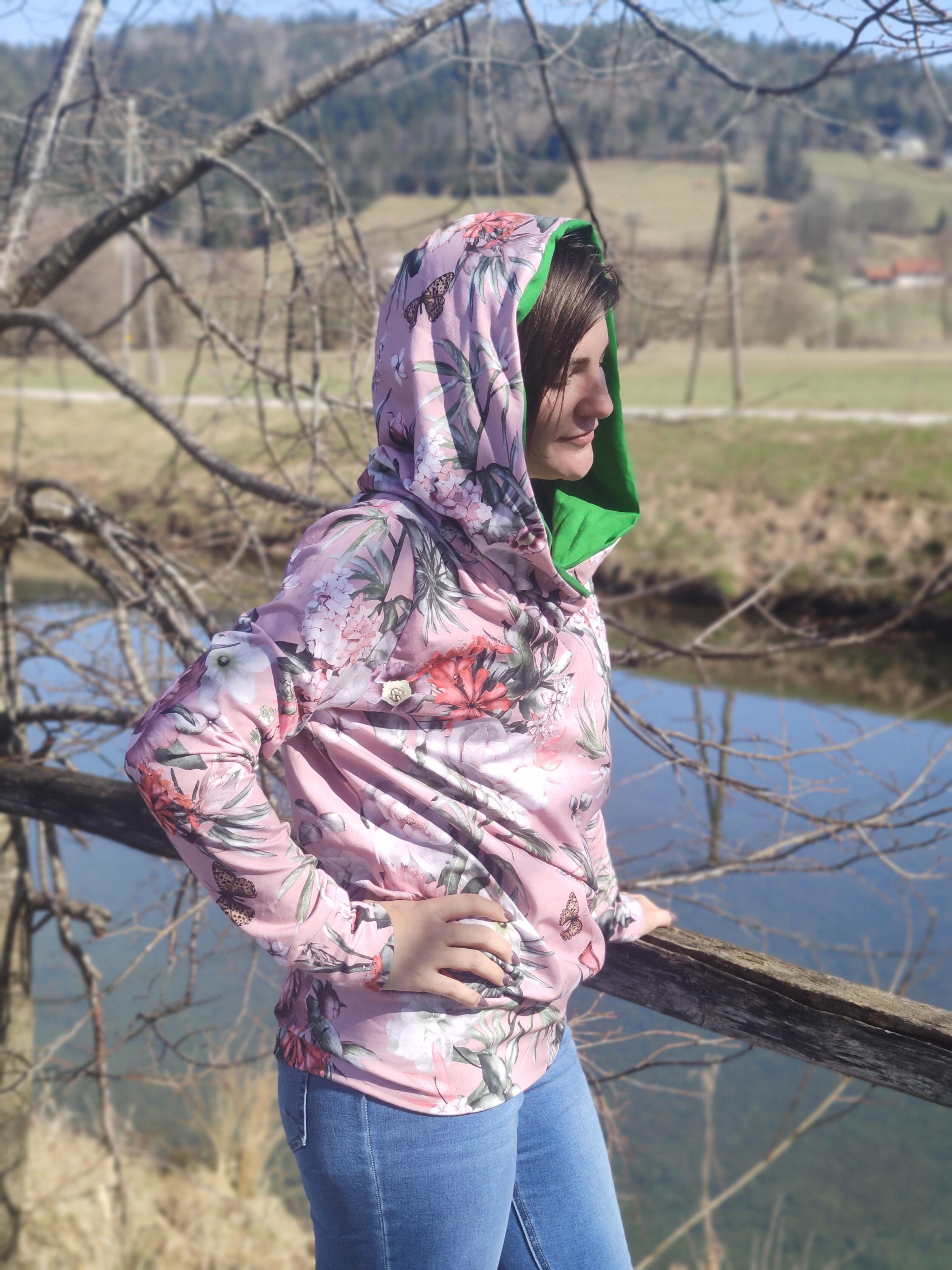 Ženski pulover s kapuco – roza s cvetličnim vzorcem